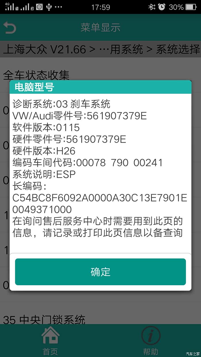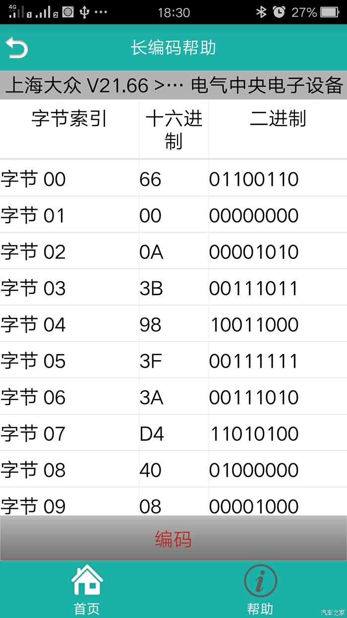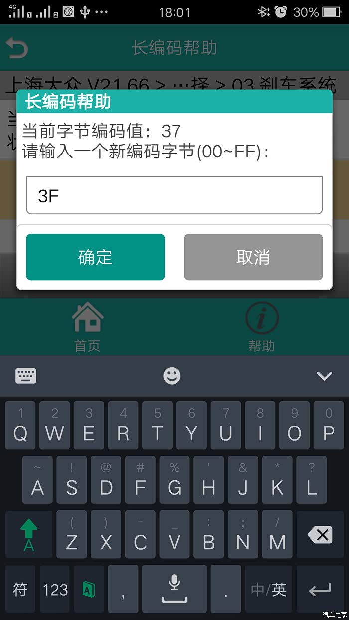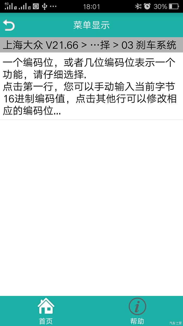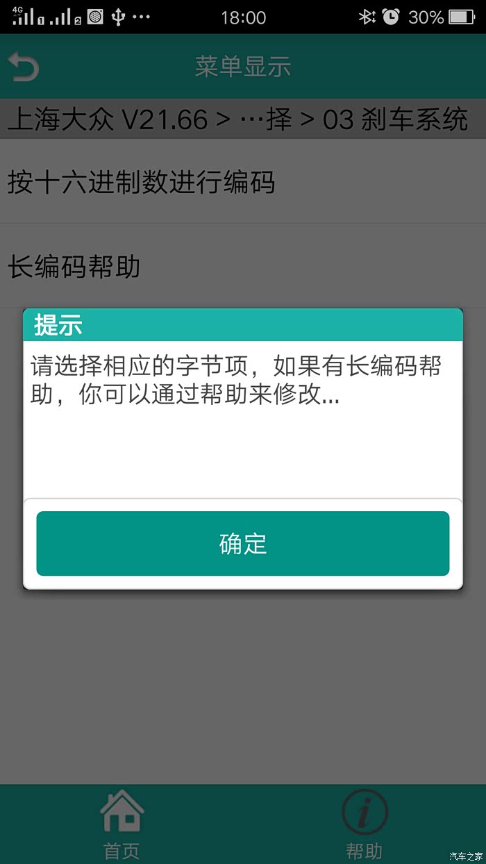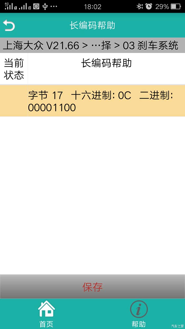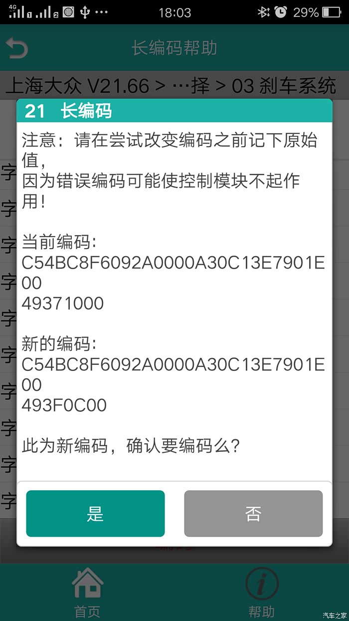 ⑵系统选择——03 刹车系统——21 长编码——长编码帮助——分别修改字节16(37)为(3F)、字节17(10)为(0C)——保存——是——编码——提示 此为新编码,确认要编码吗——是