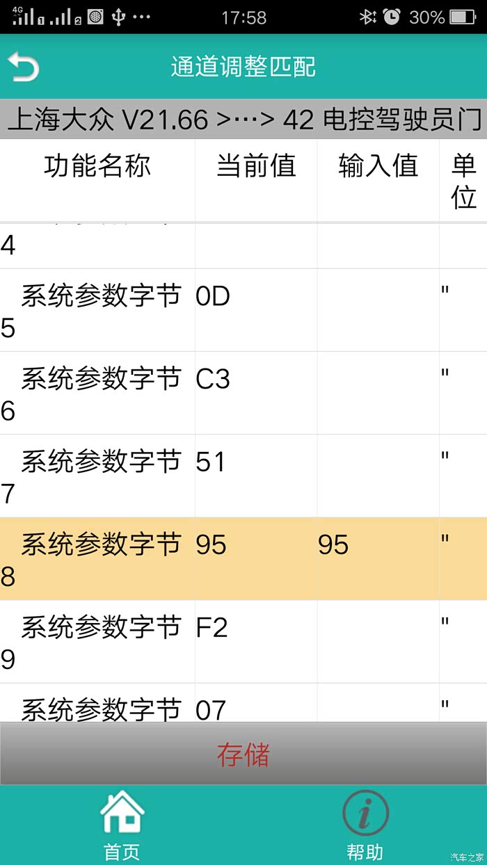 系统选择——42-电控驾驶员门——16 安全登录——密钥(04354)——10 通道调整匹配——找到 系统参数0——点击 系统参数字节8——旧的数据(90)改为 新的数据(95)——存储