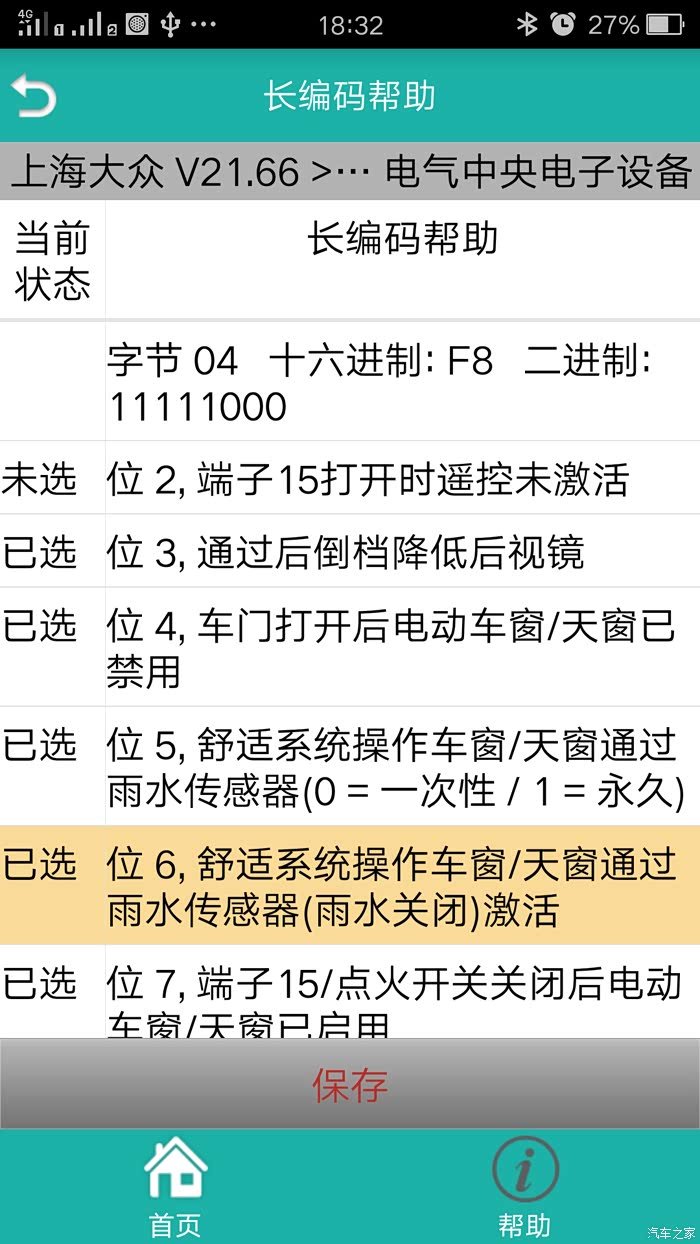 选择模块——09-中央电气系统——21 长编码——长编码帮助——字节4——勾选(Bit5雨水传感器舒适打开车窗/天窗(0=偶然/1=持久))——勾选(Bit6舒适操作车窗/车顶-(雨水传感器)(雨水关闭)-激活)——保存