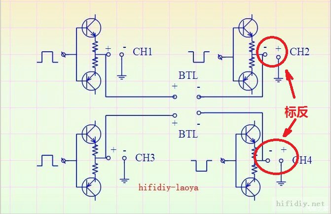 另一种是不带brige切换开关的,这种功放为了实现不切换就能桥接,左右声道设置成两路反相位的放大器,这时候输出接线柱不用再特意标反,因为出来的信号就已经是反相的了。