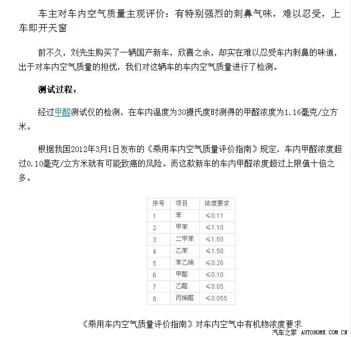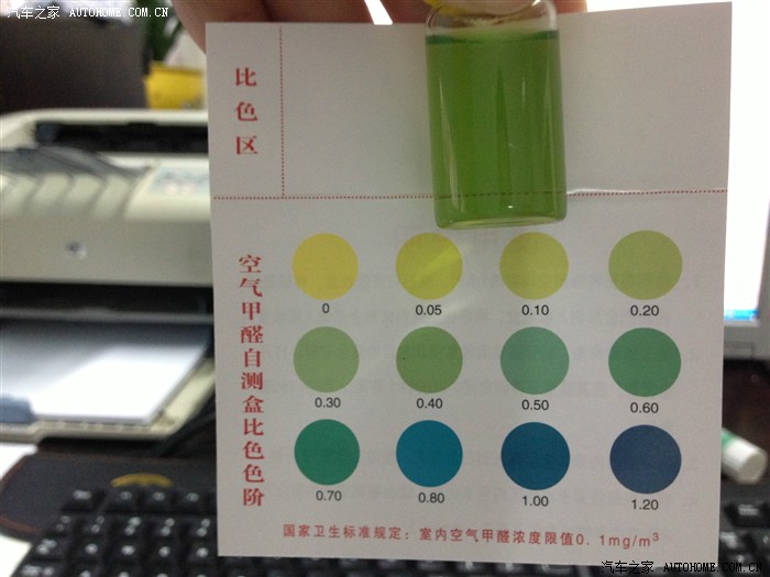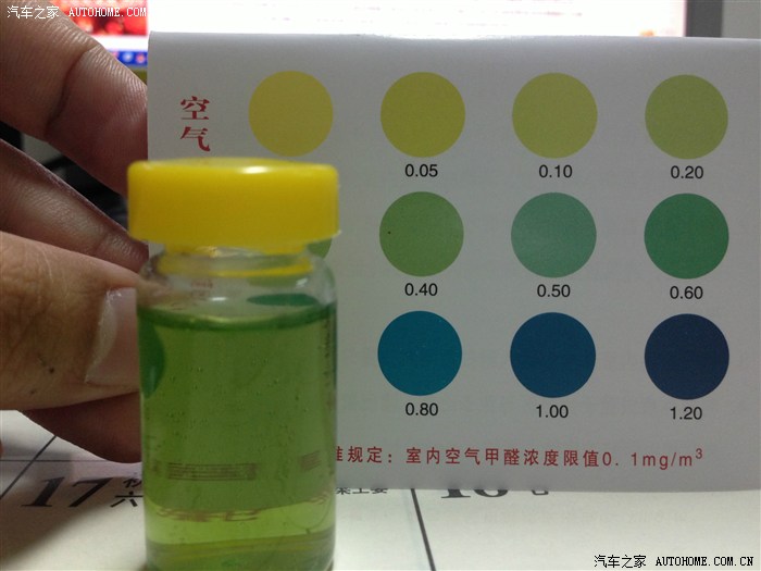 车内甲醛浓度每立方米至少大于0.4毫克,按照国家的规定至少超标4倍!!!虽然自己检测可能不太准,但是在阴天的环境中检测已经是最低标准了,如果在晴天25摄氏度下,找专业机构检测肯定比这个浓度还要大!之后我查阅了很多资料和网站,我国于2012年3月开始正式实施《乘用车内空气质量评价指南》,对车辆主要内饰材料本身挥发特性的分析,规定了甲醛浓度每立方米不超过0.1毫克。