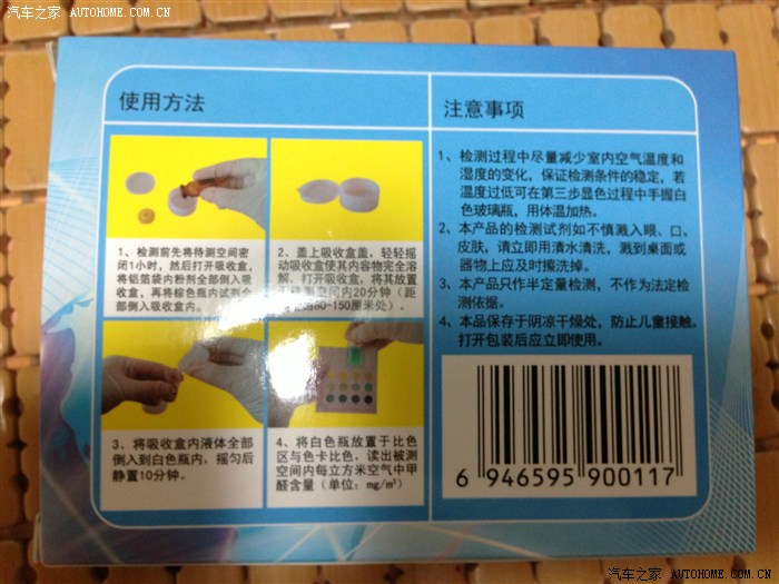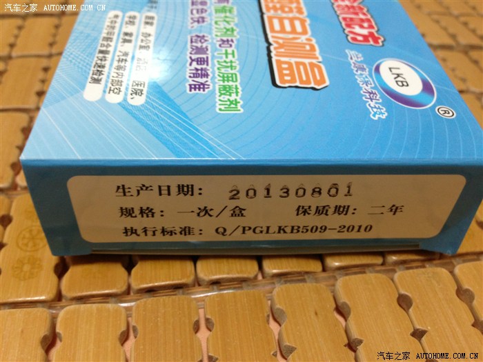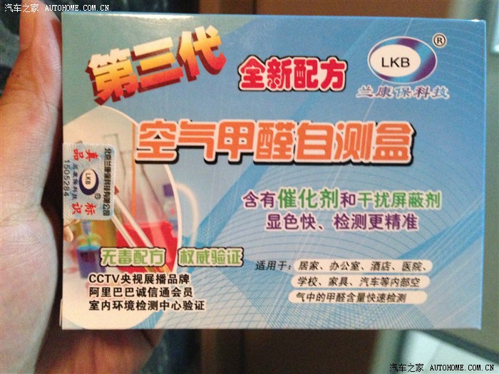 后来我看到小强热线和1818黄金眼等节目关于汽车甲醛含量超标的投诉,提到车内空气甲醛浓度限值《=0.1mg/m3,就是每立方米小于等于0.1毫克,超过这个值就是超标。我马上到万能的TB购买了两盒“兰康保牌空气甲醛自测盒”,我决定先自己检测一下。