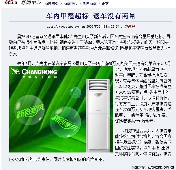 晨报讯(记者颜斐通讯员李健)卢先生购买了新车后,因车内空气甲醛含量严重超标,导致自己头顶小片脱发,他将销售商告上了法庭,要求退还汽车并赔偿损失。昨天,朝阳法院判决卢先生退还所购车辆,销售商返还车款69万元并赔偿保险费和车辆购置税等损失6万余元。