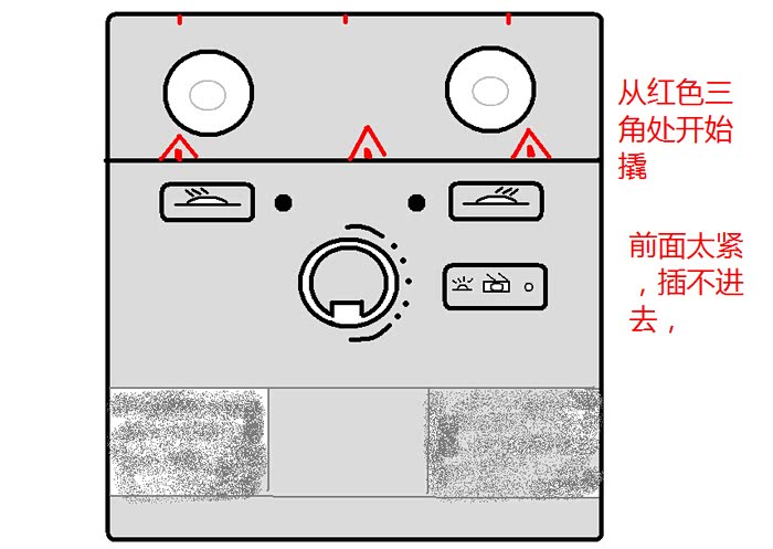 前排是老大难,灯罩比较厚,而且卡的紧,建议从后边,开关处的缝比较大,从这里撬