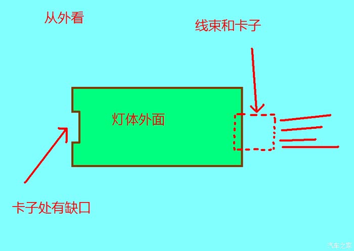看清楚了么?然后开始!这时侧视图,灰色是车内,青色是车外,绿色是灯体,左边的是卡子