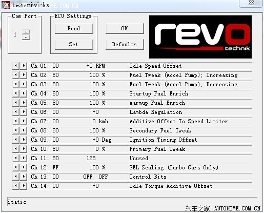 这几天一直在找关于ECU(行车电脑)调校这个话题的信息,在国内和国外的网站上看了不少关于调校ECU的视频,只不过看到只是视频(软件需付费),且没有真正的免费软件可提供下载使用,今天在网上看到了英国著名汽车改装公司Revo提供的Lemmiwinks ECU调试软件http://www.xici.net/d99533156.htm(rar文件大小100KB),自己的小派发动机怠速稍高900转/每分钟,打算买根VAG-COM线用lemmiwinks调试一下,不知道此软件的帖子在我们派力奥论坛 有没有大神发过(坛子里我没去细找,知道此软件或已使用过的朋友别喷我啊),总之我是按耐不住了,不光自己拥有它也要和大家分享。ecu参数调整软件revo lemmiwinks (警告:请谨慎使用!!!) revo lemmiwinks与vag-com对发动机ecu调整是一一对应的个人通过试验改变ecu单元的1-14通道的参数值后。用vag-com对改变ecu单元的1-14通道的参数值检查,确实是一一对应的关系。用vag-com修改的1通道参数值,revo lemmiwinks确认。用revo lemmiwinks修改的1-14通道参数值,vag-com全部认可。revo lemmiwinks能读取1-14通道,并能调整所有通道参数,vag-com 也能读取1-14通道,仅能调整1通道参数 revo更改设置存放在eep rom中,不会丢失,eep rom 是与闪存芯片不同,主要是发动机控制程序, 并且因此变动不会影响代码检查。如果担心改变会影响发动机,可以恢复默认工厂设置,回到汽车改动之前的设置。revo列出ecu的适配通道、典型工厂VAG 控制范围、最大可能的控制值,将直接地写对连续eeprom 的变化 。