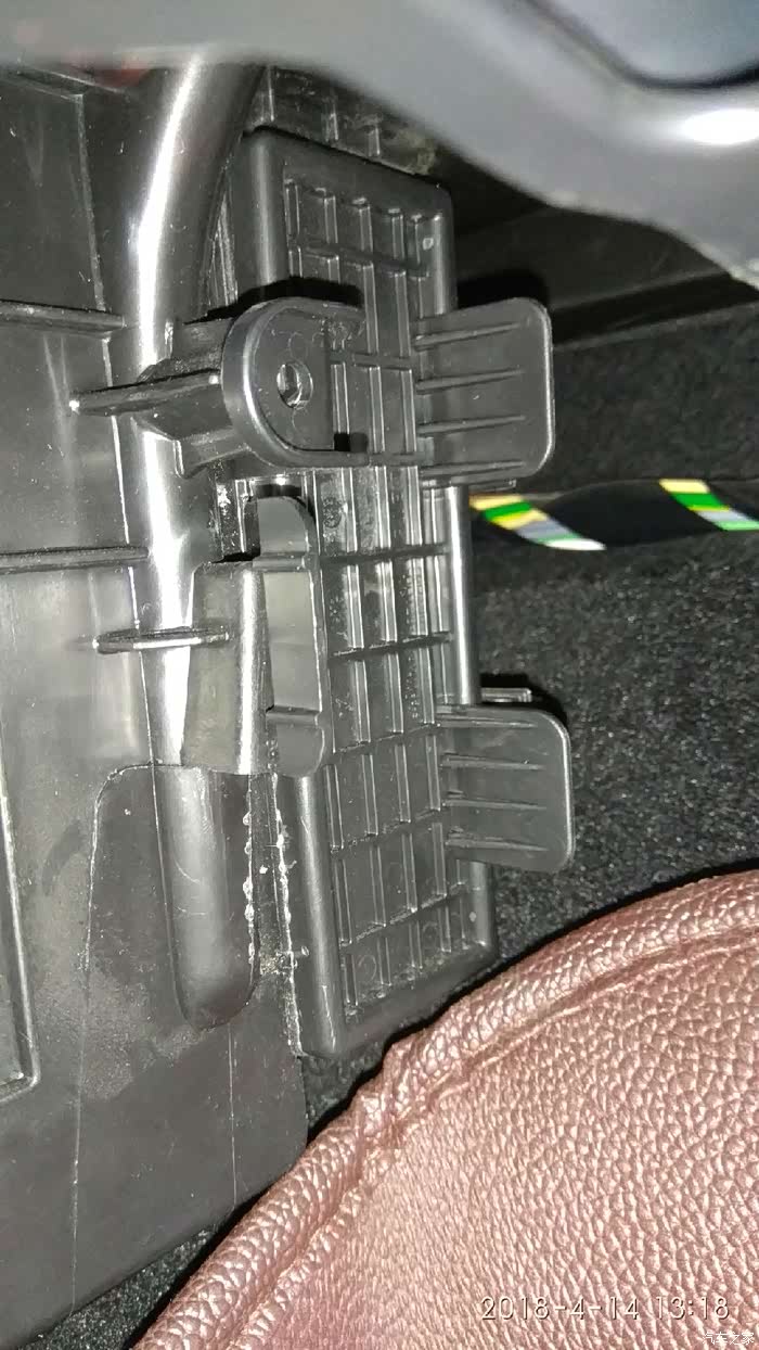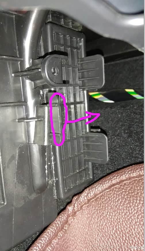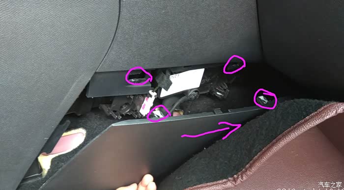 之后,将塑料板向车头的方向拉,一边拉的过程中,同时向副驾驶车门方向拉,拉开后就可看到有2个卡子,是和机架连接的,回装的时候注意对号入座。