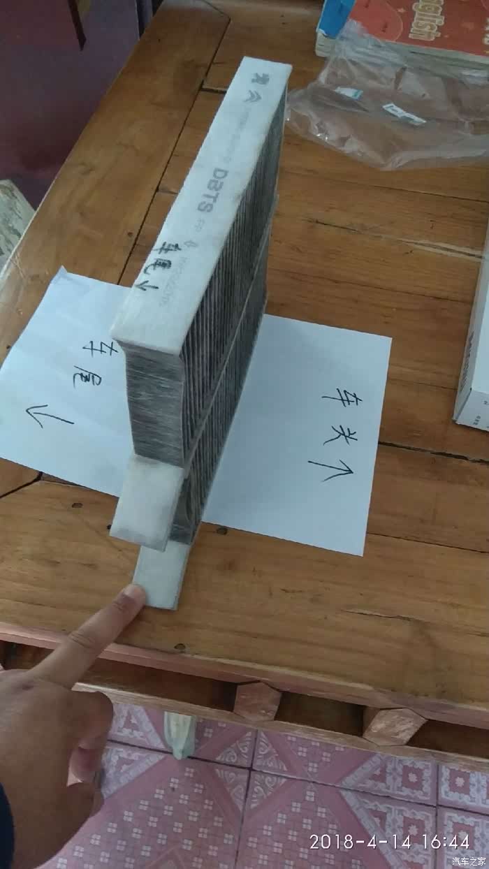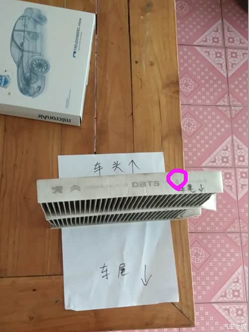 画圈部位就是箭头,所指的就是安装方向,以旧的滤芯为例,图中滤芯摆放位置就是安装时的位置,滤芯上有箭头标注,箭头指向的是车尾的方向,另外小尾巴得要向外,也就是朝向副驾驶的车门方向,这样便于下次拆卸。新的滤芯也是如此安装!