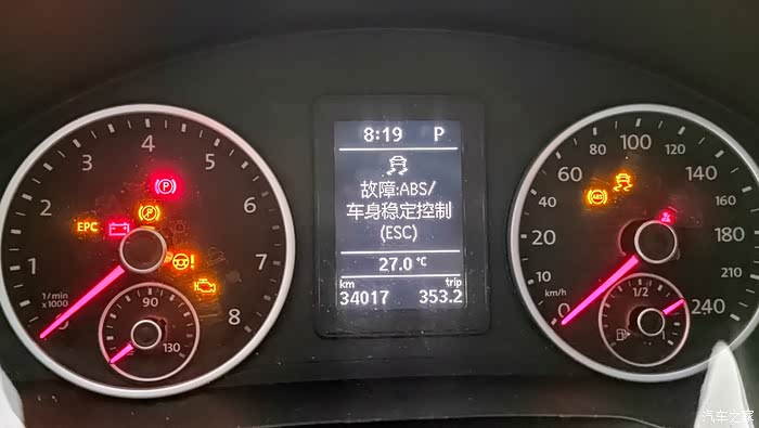 仔细一看,竟然有电子驻车、方向盘助力、ABS、车身稳定和胎压监测等五个故障提示。