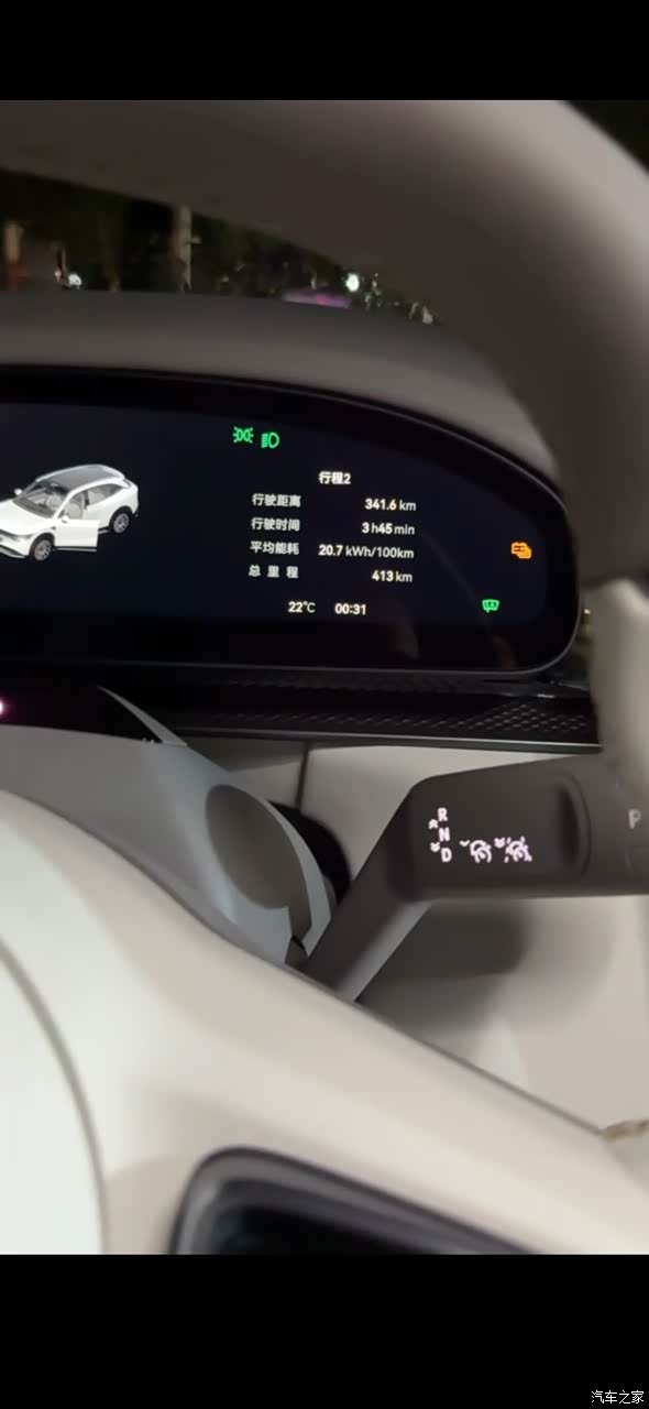 行驶100公里之后,全程高速下雨,能耗也明显有所上升至20左右,行驶了3小时40多分钟,341.6km我们下了高速,当时已经测到凌晨一点多,我们就下了高速 ,没有完全跑完电,当时表显还有7%电量.32km,