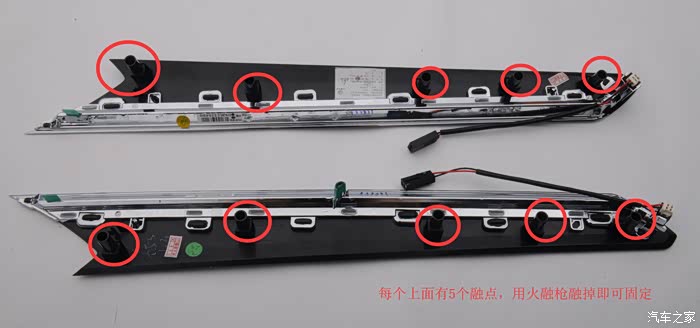 四门氛围灯不用镙丝和卡扣固定,都是用电烙铁,把这几个点融一下粘紧在背后的胶上即可。