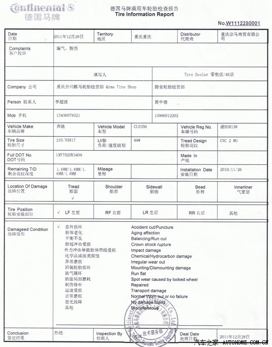 我于2011年购换的德国马牌轮胎(经过授权代理商鉴定为德国马牌正规货)、还不到几个月就产生严重脱胶质量问题——脱胶(见图)。向代理商索赔,德国马牌总公司却谎报我消费者正确信息(《德国马牌乘用车轮胎检验报告》见图)拒不负责,我的车乃是吉普,2011年12月23日申请,2011年12月30日才给予结果,以往的那种迅速处理问题的宣传,是欺骗我们么,居然给我谎报成奔驰,车牌号,车型,安装时间都变更,居然以意外损坏为由拒负责任。如此不敢于承担自己的产品问题的行为,真让人寒心!强烈指责德国马牌的虚伪,产品伪劣,望各位引以为戒,不然后悔莫及!如下公布照片及德国马牌的检验报告,供大家借鉴,维护广大消费者权益!