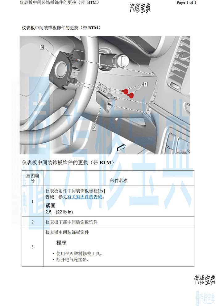 另外我担心拆的越多坏的越多,没有按这个一步步来。我没有拆启动开关和大屏面板,直接拆第三步的仪表板下装饰板。从右侧小心向左拆,不全拆下只要能看到螺栓就够了。但是这个下装饰板有几处是卡在大屏面板里面的,这样拆无法全部拆下且容易损伤大屏的装饰面板,不推荐。