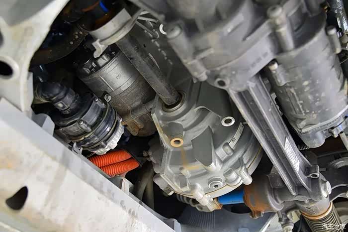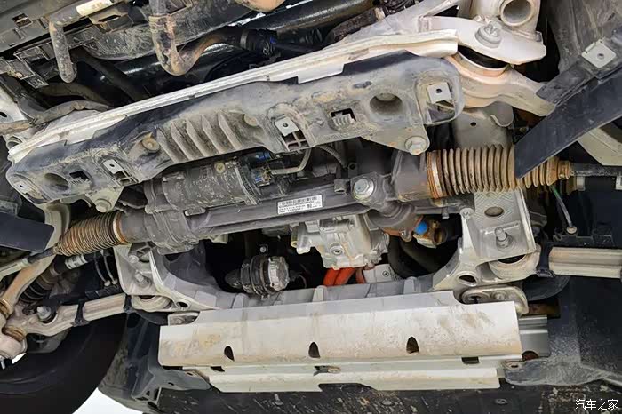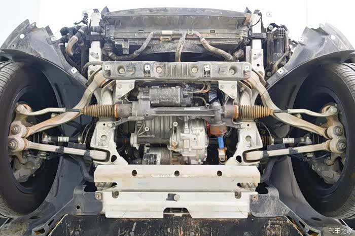 这一组钢管架将电机和电控全部包围,后方延伸到车体中部。很显然,这是利用了原先汽油车纵置发动机和变速箱的空间,对电机电控进行结构性保护。不仅能增加整车强度,还能让前电动机不至于在撞车时,侵入到驾驶舱。这种设计我们还是第一次见,在其他电动车上是没有的,传统大厂在车身底层逻辑方面,确实比新势力们想得更全面。
