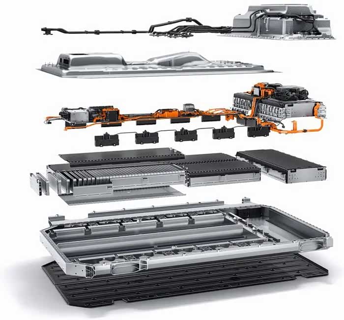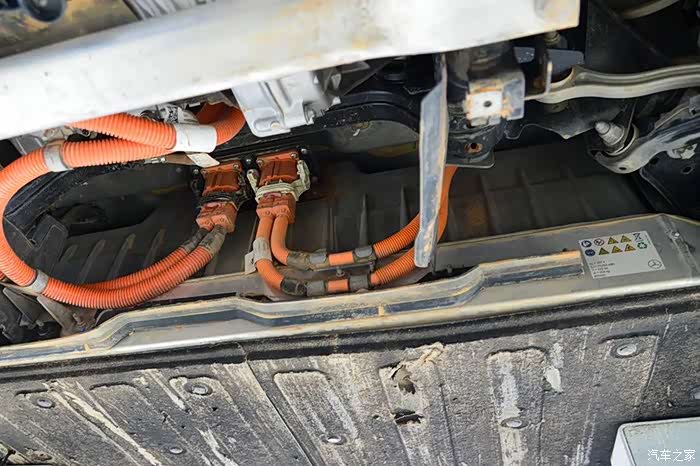 电池组的封装由北京奔驰完成,由电池组由后罩盖、电池外壳盖、冷却管路、电池管理系统、橙色高压线束、侧面的电池监测单元、电池模块、框架结构和底板组成。包含6个电池模块,其中4个由72颗电芯构成的大模块和另2个由48颗电芯构成的小模块。充分利用原先汽油车变速箱、排气管、中央驱动轴及油箱空余出来的位置。