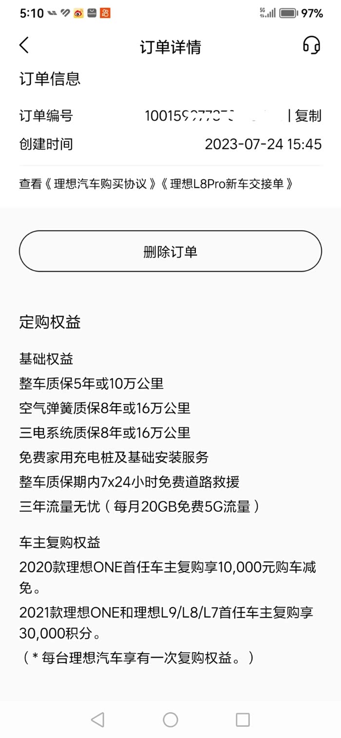 7月15日左右试驾的,7月24日鼓足勇气(毕竟这么多钱呢,在父母眼里车子不要超过30W,虽然自己出钱,但是也怕挨骂啊),决定订车,订完车很快交付专家联系我,然后就是犹豫期,本来下订了MAX版,但是交付专家说MAX我要的黑黑橙,估计要等段时间,我这个心呐和猫爪子挠似的,等不了啊,再加上交付专家的建议,要么直接上9要么就8pro性价比最高,我们地区一般订8的,PRO 也是最多的,很少8MAX,而且PRO得来车快,犹豫期修改了8Pro,现在想来,交付专家还是很真诚的。附订车截图。