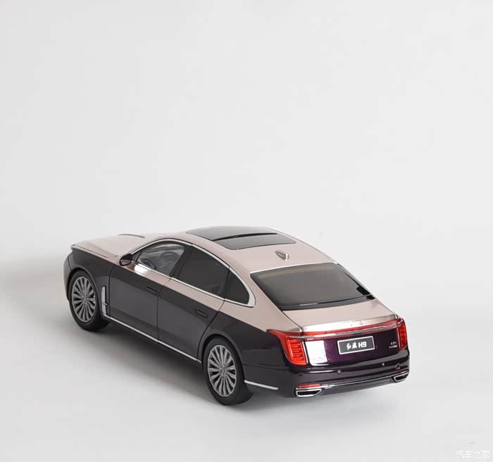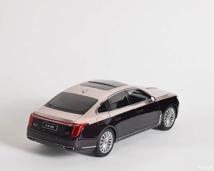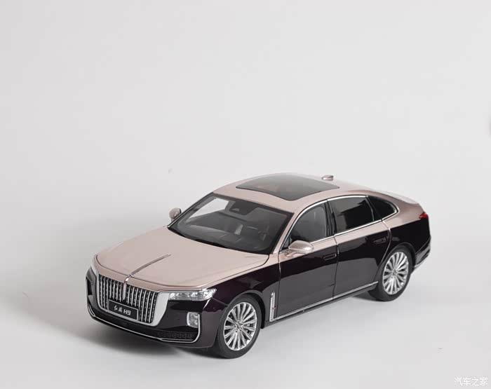 这是一款双拼色外观的H9模型,带有底座,外观素有“国产劳斯莱斯”的称号,前脸大尺寸的中网,配合具有逐渐点亮的日间行车灯,气势优雅又不失豪华,侧面很修长,尾灯的尺寸与辨识度也都不错,同样具备逐渐点亮的效果。
