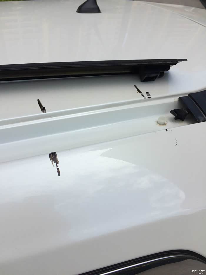 这次貌似服帖了,上下左右是平的。这时就可以往下按紧了,轻轻拍打,使胶条上的卡扣和槽里的卡扣扣在一起。这时,车顶胶条上除了凸起的螺丝杆,等于又恢复了原样,剩下的过程就很简单了。