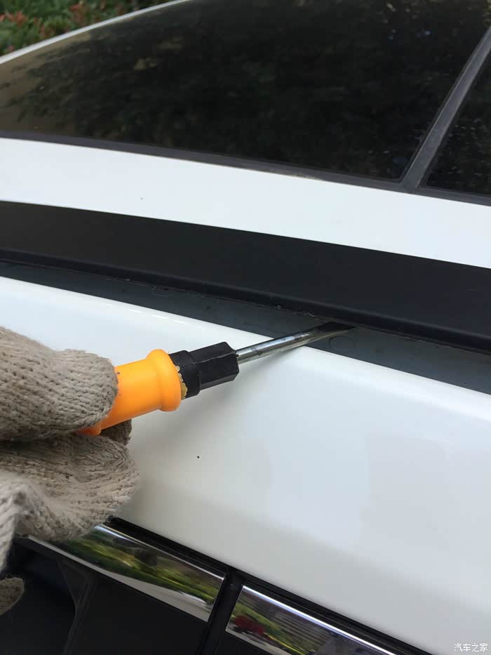 踩着凳子或者踏板,把车顶的黑色胶条从后往前撬起来,注意尽量把改锥往里面塞一点,用力要稳,不要猛撬。因为是卡扣相连,撬开的时候会有“咔”“咔”的声音。