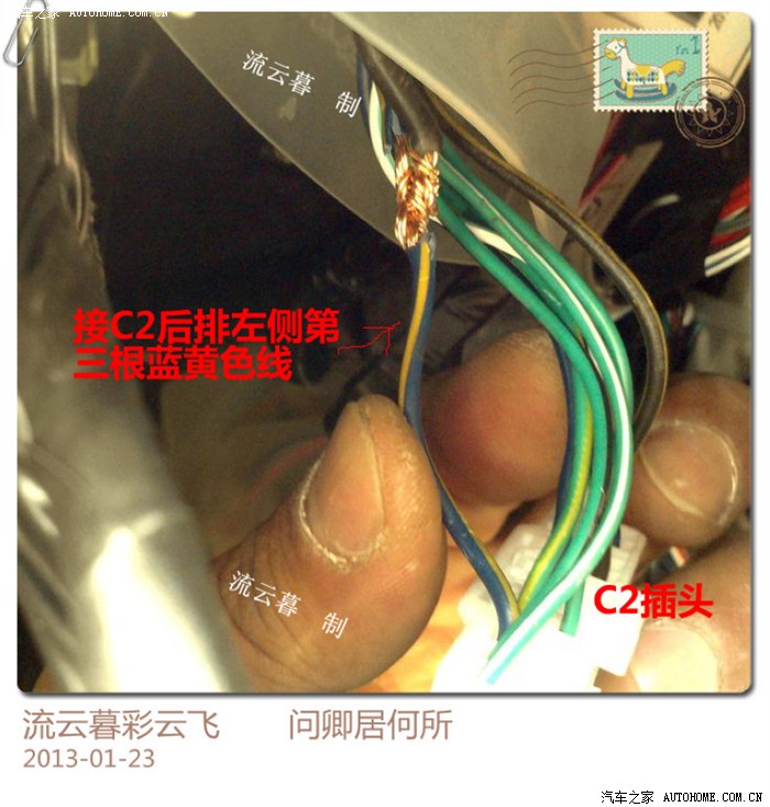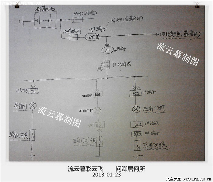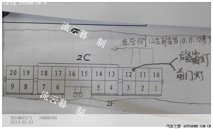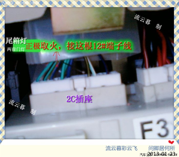 F3后备箱灯与2个前门灯的正极火线为一条线,很多朋友 在加装时不知道在哪里取火。