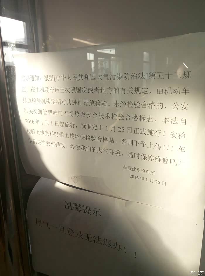 到了办事大厅就看见了这个通知!看来还是有不少人不检尾气啊~
