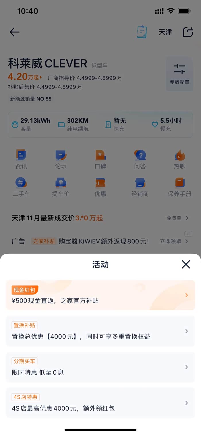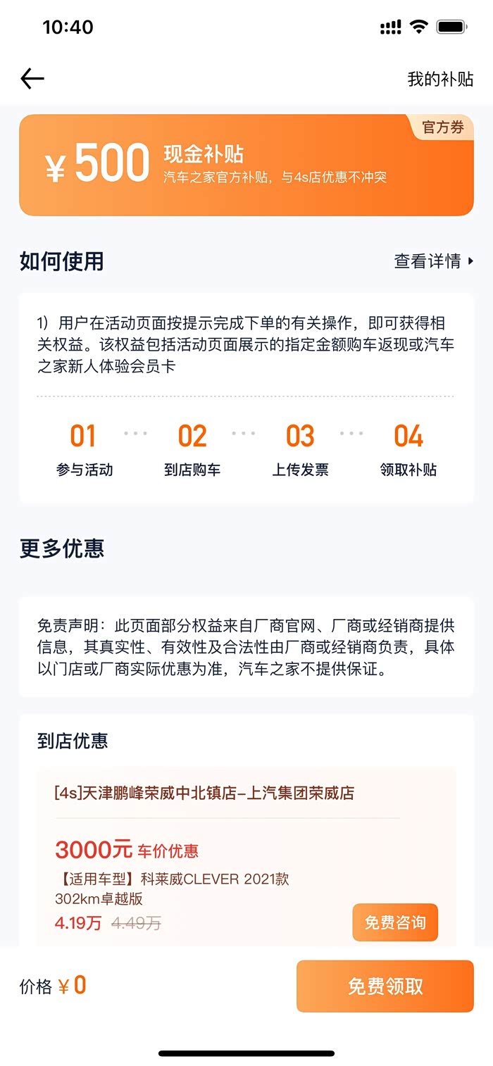 我于2021年11月4日上传了全部凭证,汽车之家平台反馈订单已满,但是我查看科莱威首页时这个活动还有,因此我打客服电话,客服反馈只有5台可以获得500元补贴。但是在下订单的时候根本没有提示,并且现在还有500元这个活动。由于上传发票或者直系亲属买车需要上传户口本,从保护隐私角度,提醒大家谨慎上传。