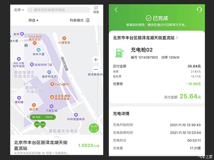 如果我们外出需要使用快充,我试过一次开迈斯充电,电流很快,半小时内电量充到90%以上不是问题,唯一就是电费比家庭慢充要贵一些,分时段计费,比如谷时电费1.09元/度,平时电费1.55元/度,峰时2.07元/度,充电费用里每一度电含有0.8元的服务费。