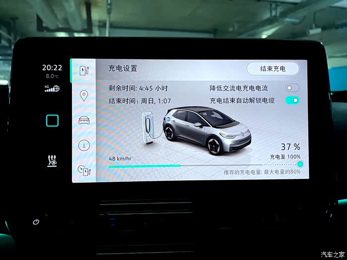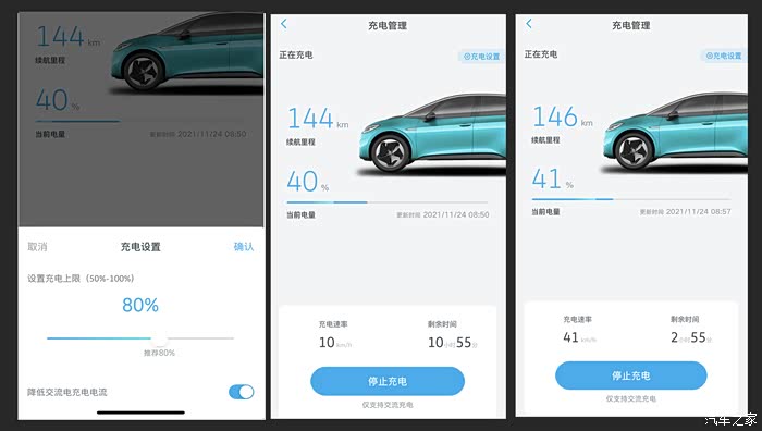 在交流电充电的状态下可以通过上汽大众超级APP设置充电管理,在这个菜单下可以设置充电电量,日常充电推荐电量上限80%,另外一个设置是降低交流电充电电流,低电流充电效率约每小时充电10公里,标准电流充电效率约每小时充电40公里。