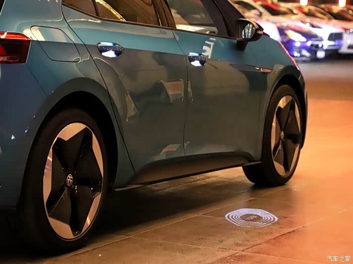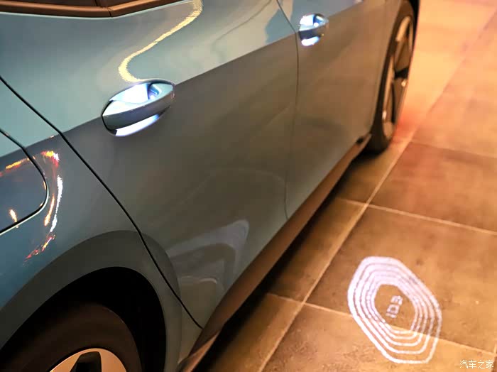 首先ID.3解锁车门的方式就已经和传统车型有了区别,当我随身带着车钥匙走进ID.3的时候,大约在距离车头一米多的位置,车辆自动解锁车门,点亮大灯,自动打开外后视镜,同时外后视镜的迎宾灯在地面投射一个大大的ID.3logo,车辆与用户之间的交互体验就此打开。