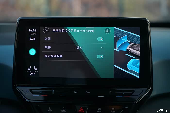 10英寸悬浮式中控台偏向驾驶员,屏幕的触摸操作跟手机非常接近,屏幕下方的触摸按键依次是主菜单、空调、驾驶辅助、驾驶模式,通过触控这四项常用功能,可以开始显示相应功能的设置页面,便于驾驶员进一步设置。