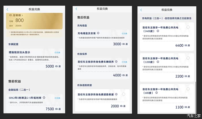说到这里,跟大家分享一下关于下单赠送的20000ID.豆,兑换了增强现实抬头显示需要5000ID.豆,兑换首付50%两年零利率需要7500ID.豆,兑换充电柱和安装服务需要3000ID.豆,首任车主独享终身免费车辆保养需要4000ID.豆,现在还余500ID.豆,我最近在上汽大众超级APP圈子发布了看车提车的照片跟车友分享,通过分享可以赚ID.豆,这个环节特别好,鼓励车友之间多交流,ID.豆余额可以根据自己的需要在APP里的VLife商城兑换相应的产品或者服务。 厂家提供了很多权益,大家可以根据自己的情况,选择自己需要的。