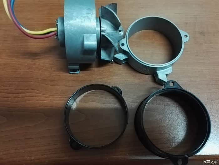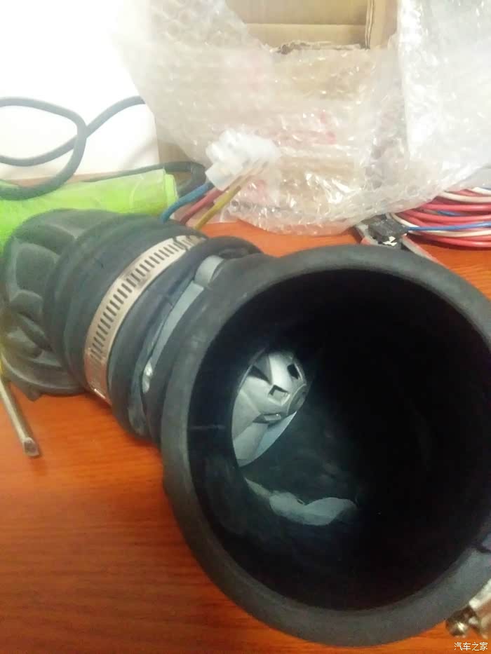 ,在车间接到12V的电瓶上试了下,效果还不错,风量比较大。由此产生联想了,可不可以给自己的小三也加个电动涡轮,增加发动机的进气量,使燃油燃烧更加充分,进而增加扭矩,降低油耗呢?