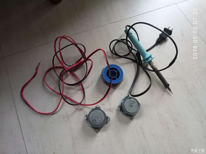 接着要把喇叭连接上电线待会要接在尾线上。电线选的是红黑线0.5平,因为正好有多余的,电烙铁放了几年了现在可以出来热热身了。