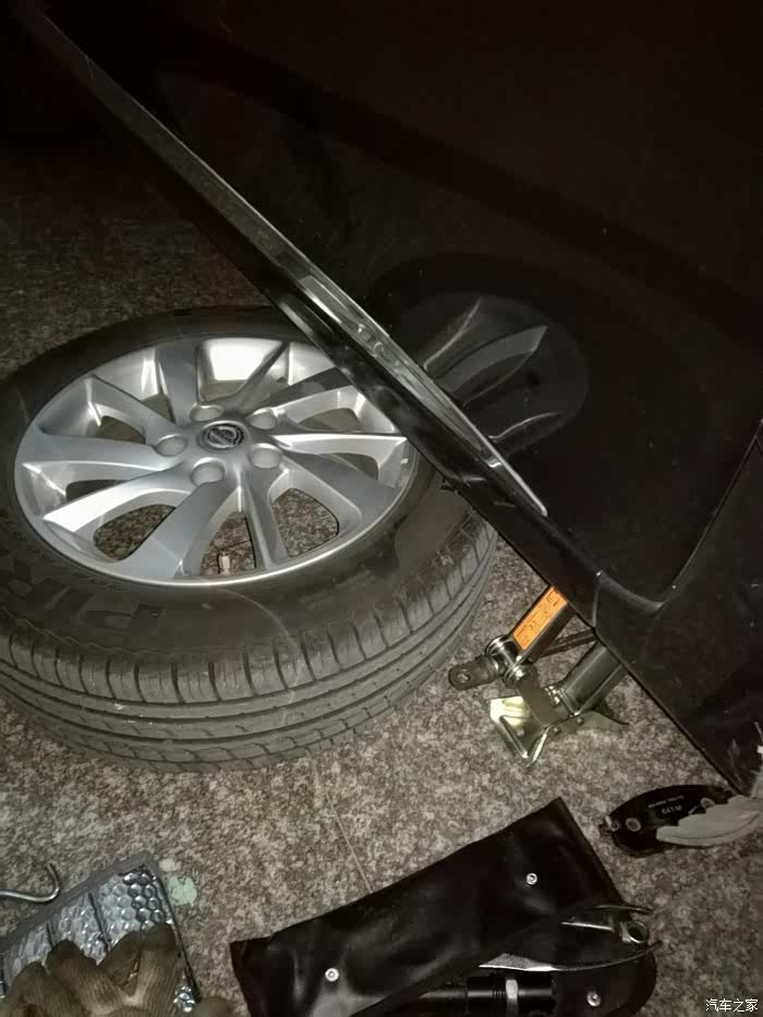 不说废话,千斤顶撑起车子,卸下的轮胎一定要放在这个位置,防止车子移位发生意外。