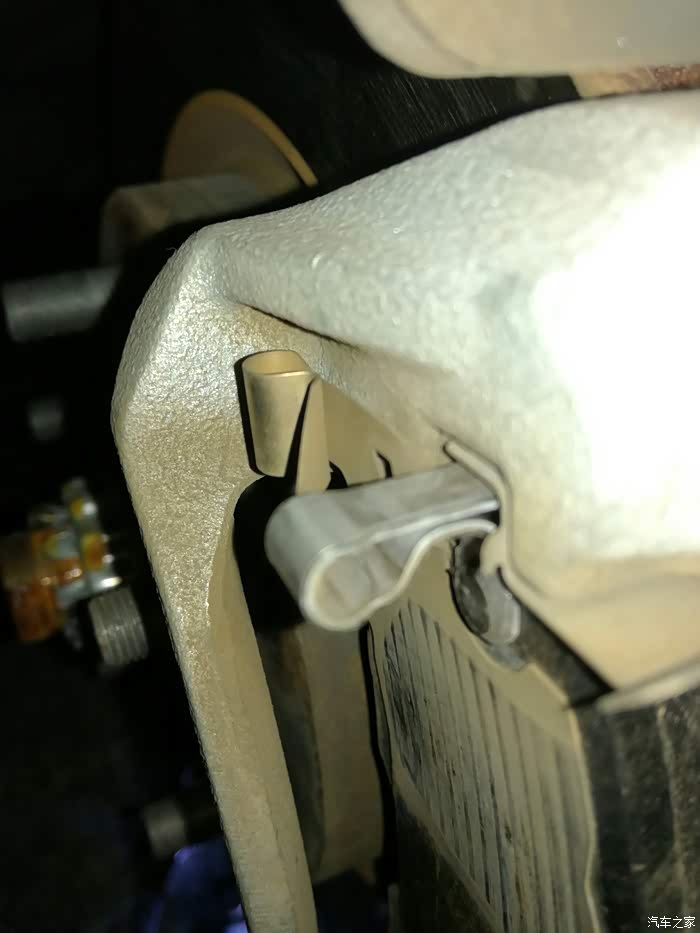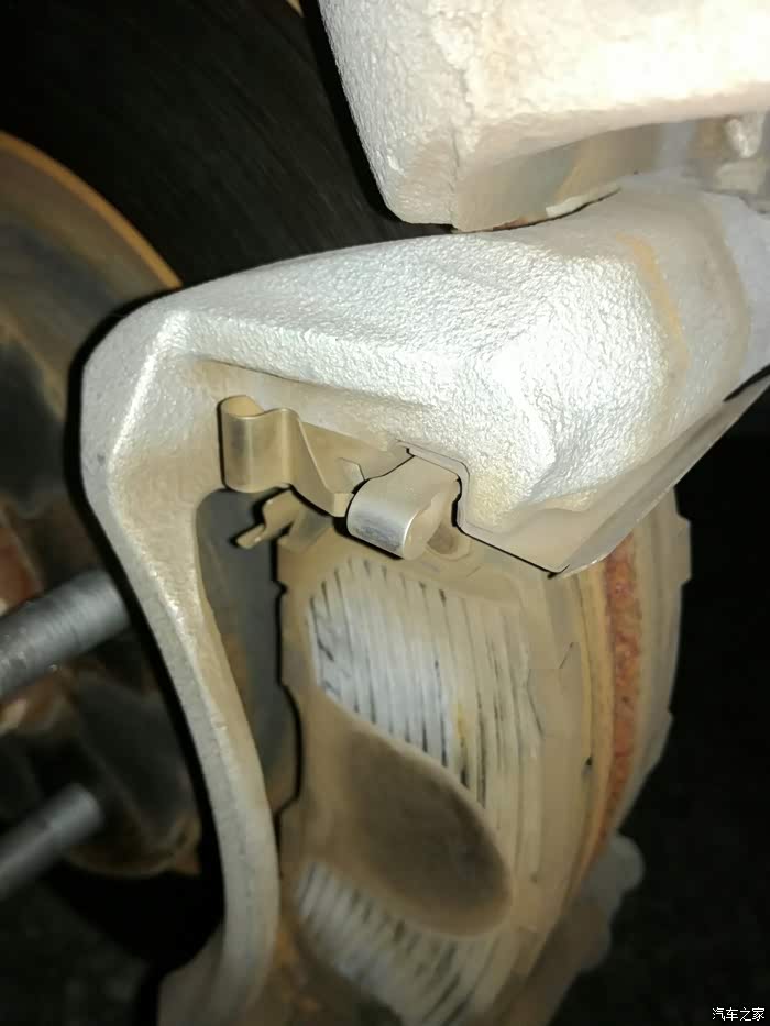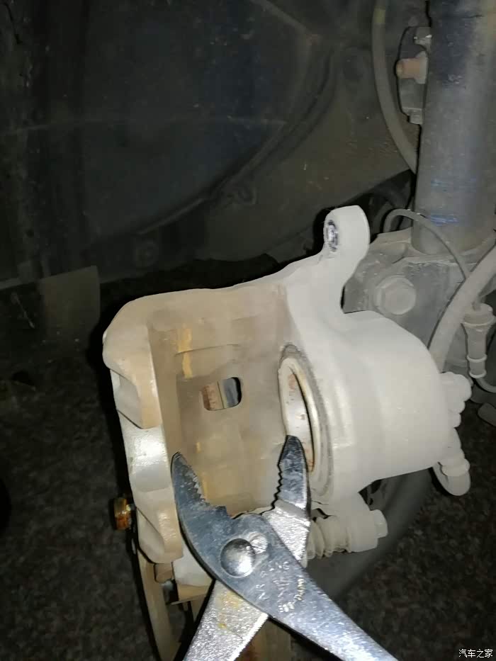 活塞的位置顶在外面,新的刹车片比较厚,所以要把活塞往里顶进去,我的办法是用大号的鲤鱼钳反向顶开。
