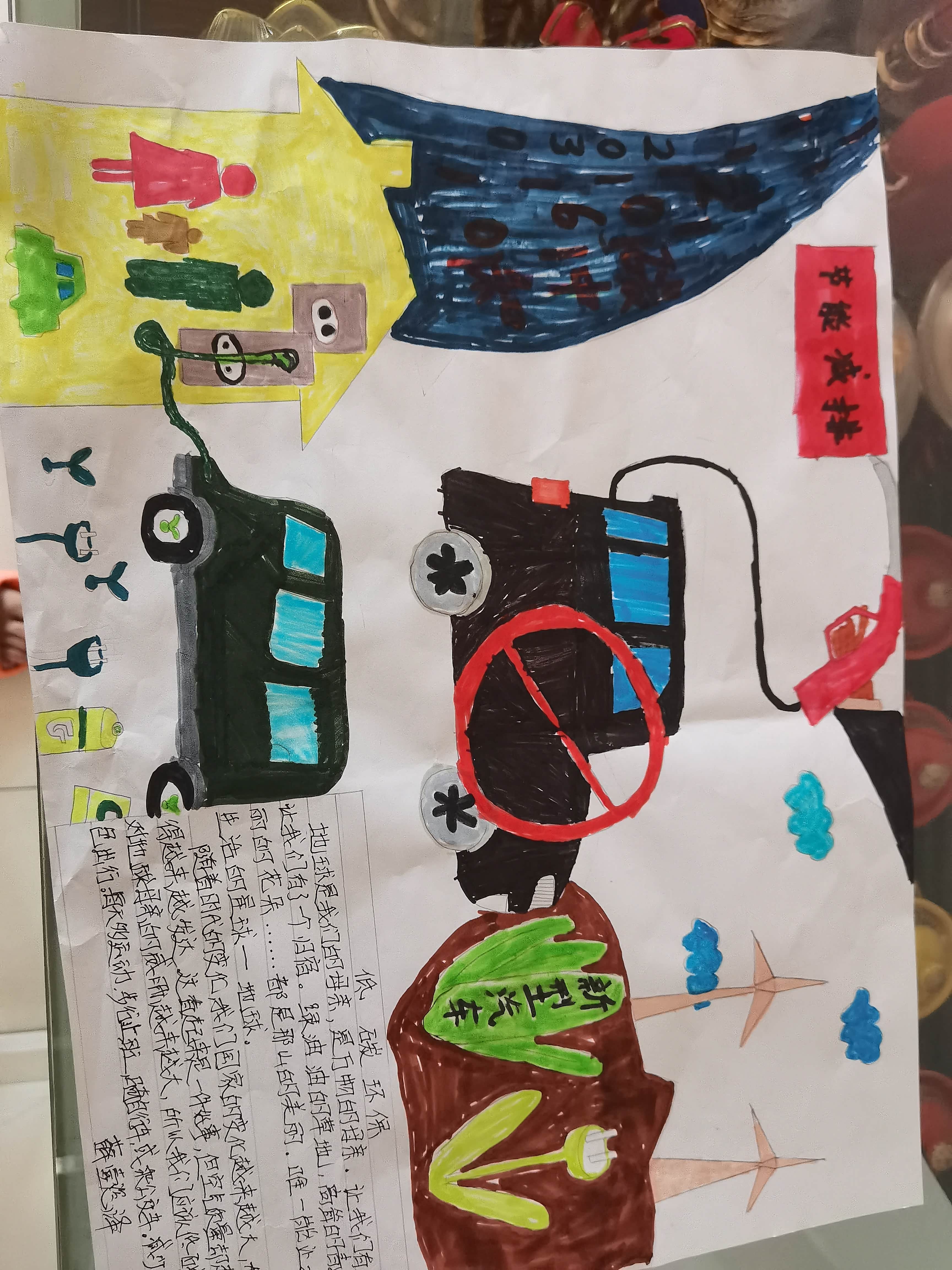 大家好,我来自孝义市府西街小学校,快来看我创作的绘画作品,这就是我心目中的低碳出行。