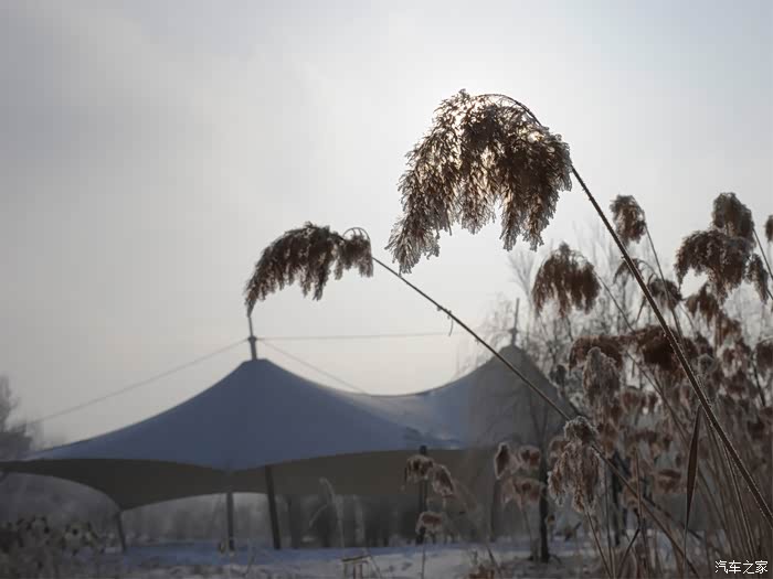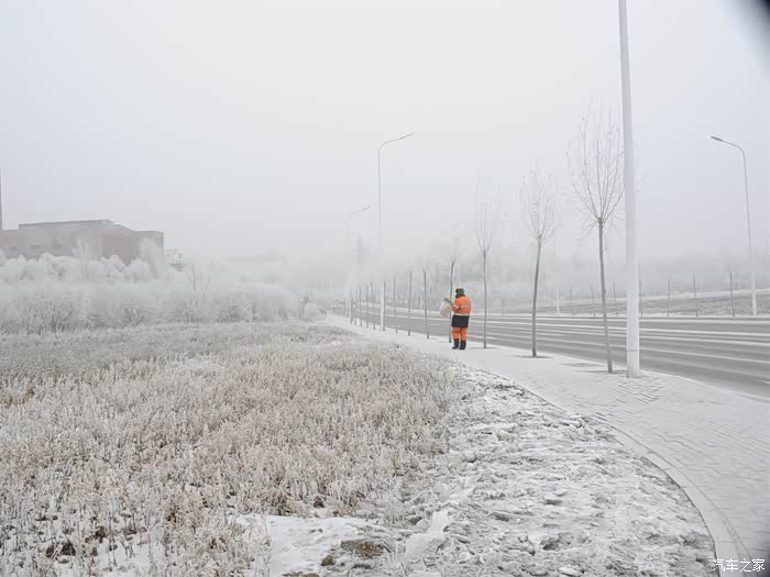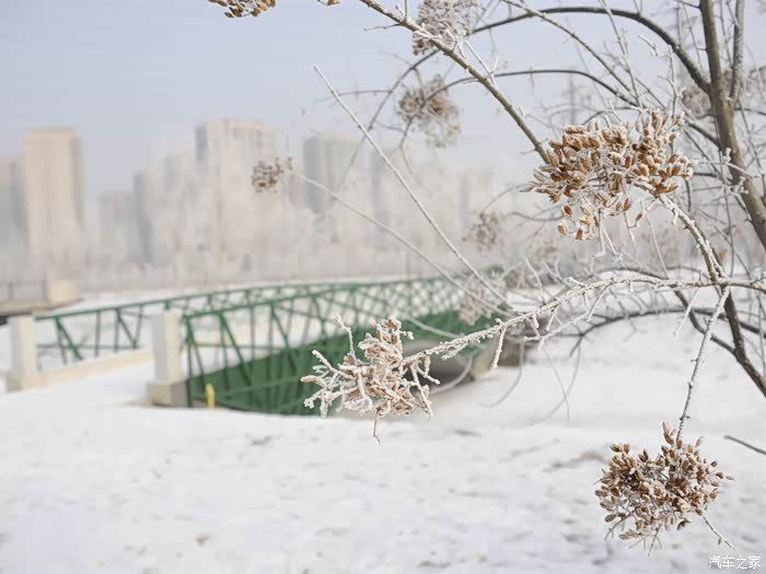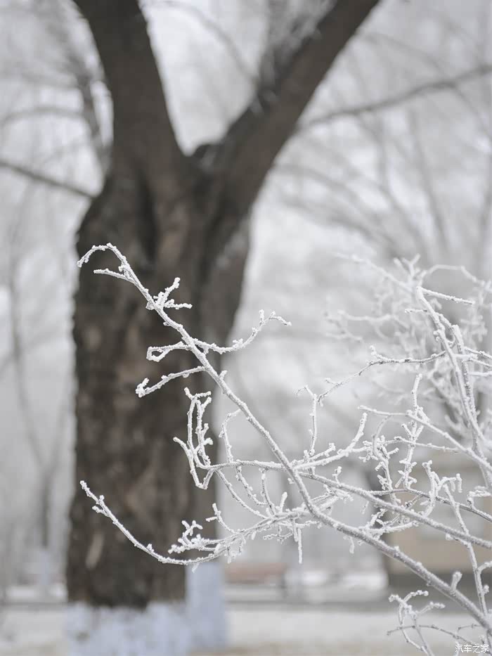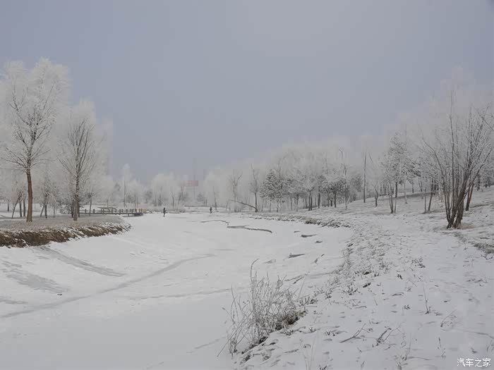 昨天晚上的一场大雾过后。树上都挂满了厚厚的霜花。当然官方的名字叫做雾凇。就是我们今天的目的地,合力同心园。