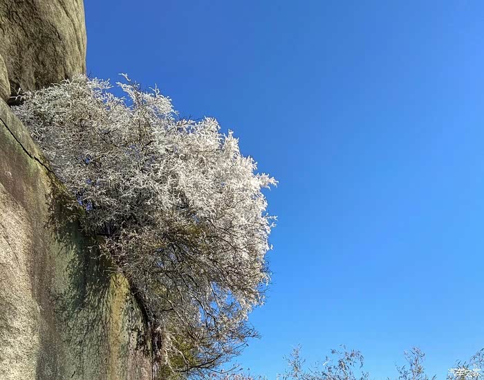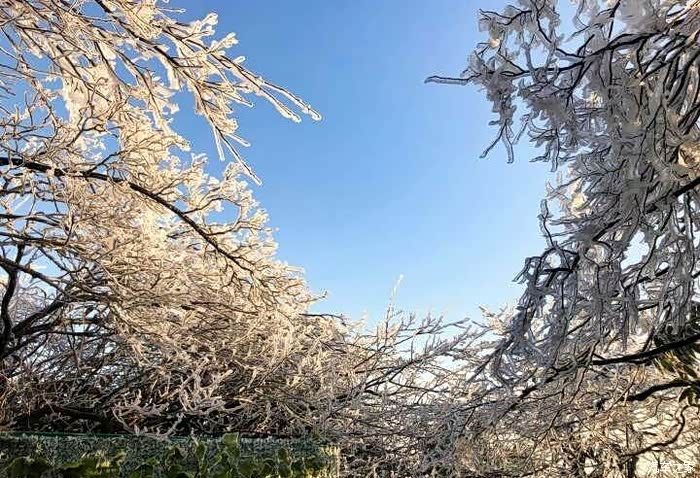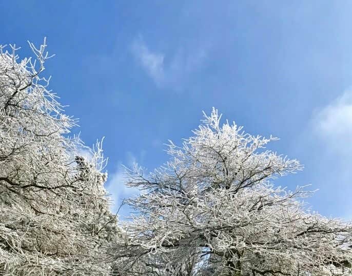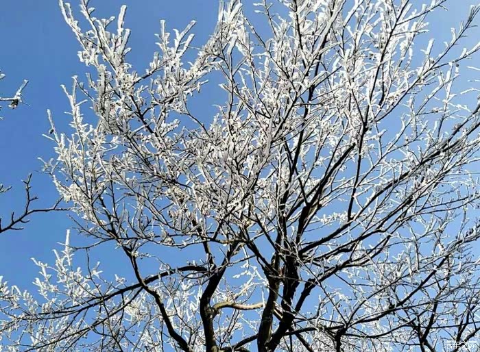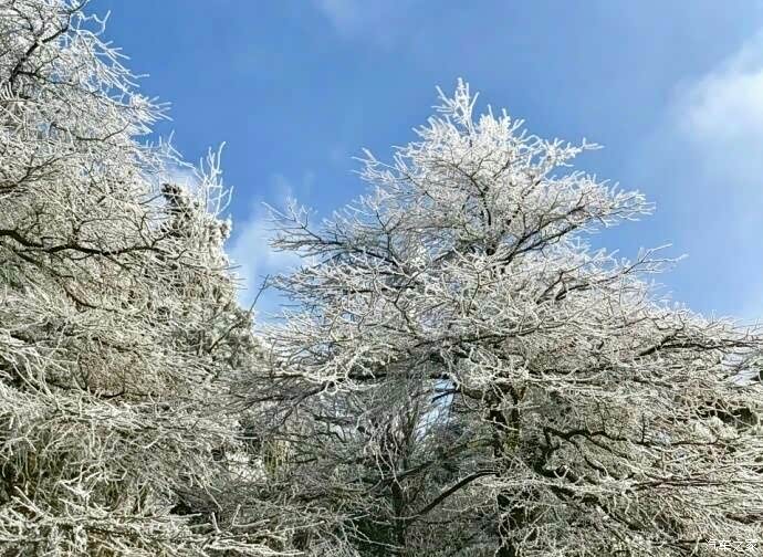越往山顶,才越发发现她的美丽,冬日的衡山,到处都是一片雪白,雾凇和冰凌在蓝天的照射下依旧挺直了身姿,展现她们独特的美,她就像从童话世界中姗姗而来,如梦如影,亦幻亦真。