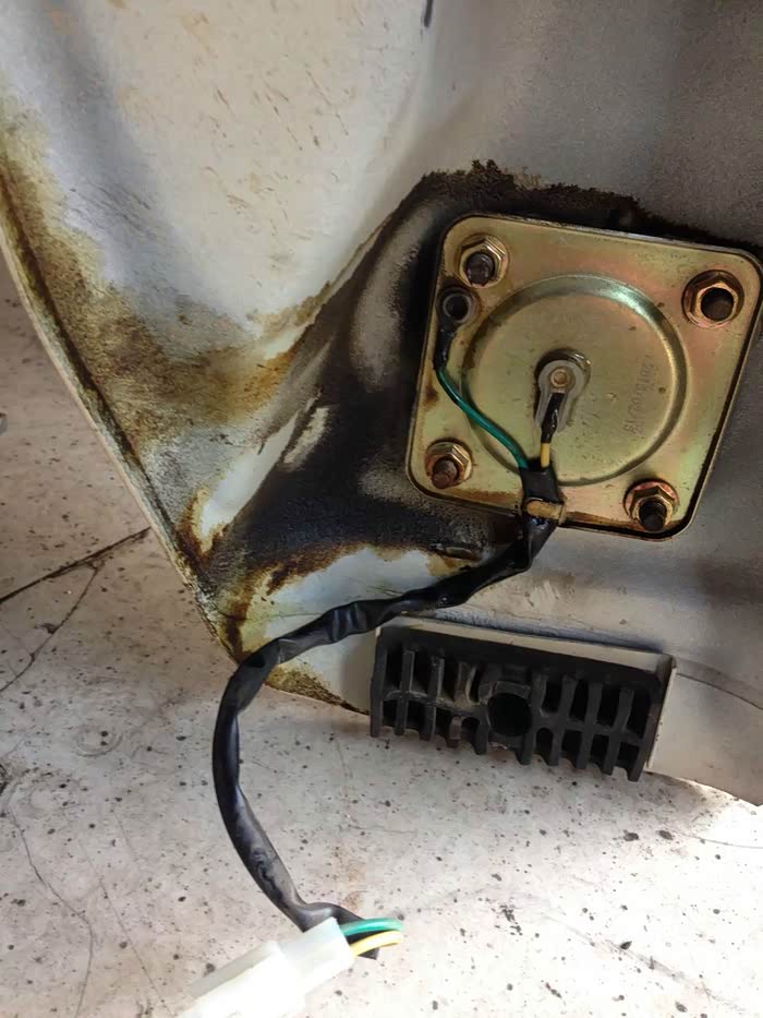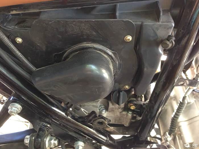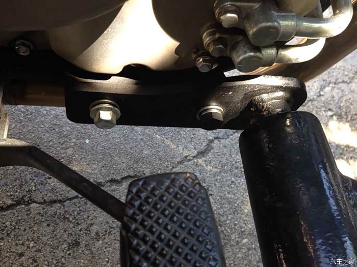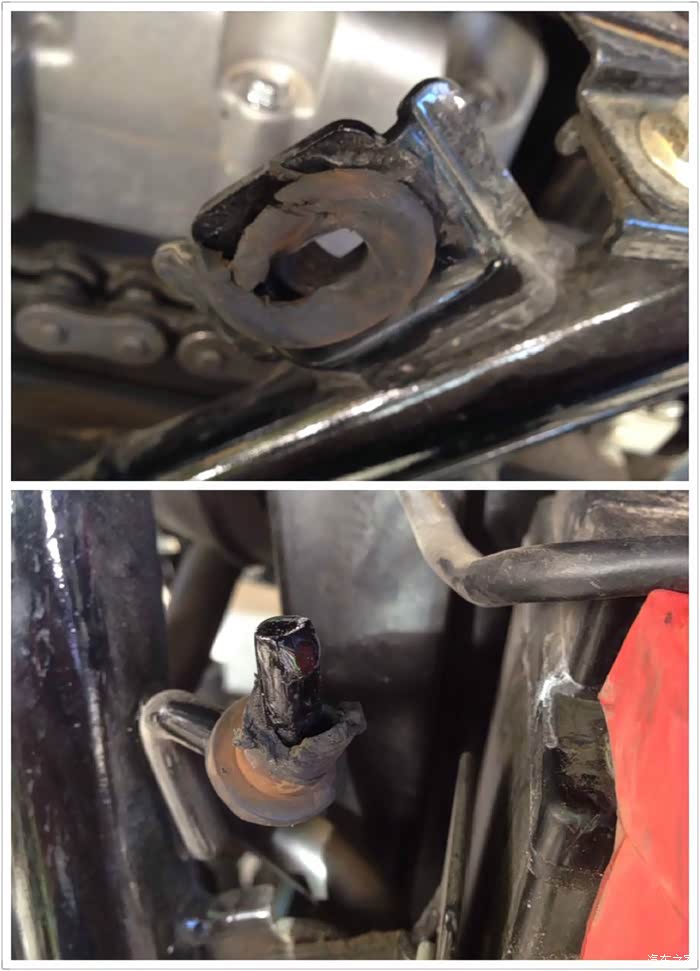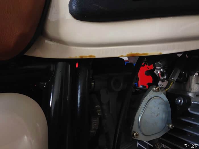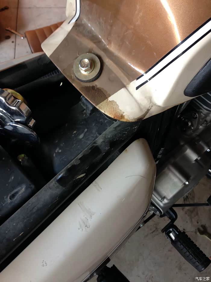漏油的就是这个地方,是因为油箱下面胶块太薄,导致邮箱密封胶圈的螺丝硌在车架上,将油箱顶漏。