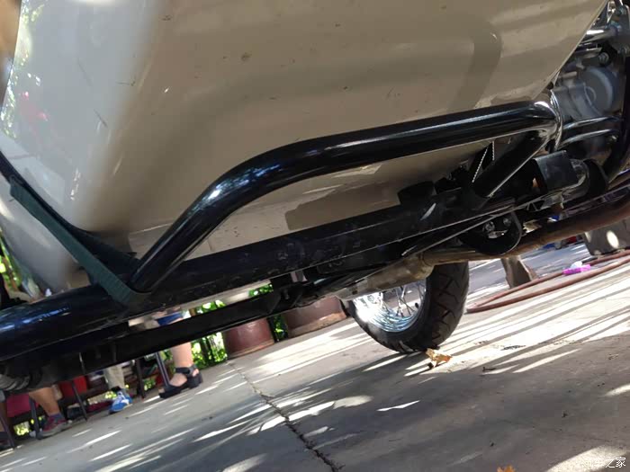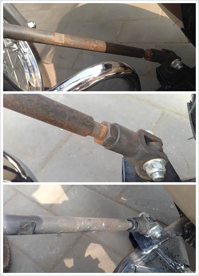 两台车将车斗后连杆向外放3公分后,操控得到明显改善。在调解过程中,其中一台车的螺丝拧到最紧竟然箍不住连接杆,这公差。。。,上面的锈迹也说明防锈处理。。。大家懂得。