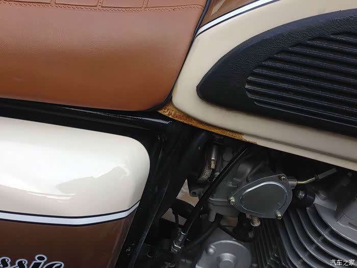 油箱侧面有橡胶侧垫,复古美观的同时,实用性也更好。油箱容积为14升,综合工况大概有不到300公里的续航里程。油箱提醒灯在还剩一半油量偏少的位置就会亮起,亮起后还有一百公里左右的航程。备用油箱约15公里左右续航。
