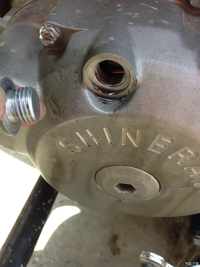 关于更换机油这里要向广大车友说明一下,鑫源400有两个放油孔,一个位于机油壶下方,一个位于油底壳左侧,整车机油容积为2.4升。放油时,要将油壶和油底壳中的机油放干净后,将油底壳螺丝拧上(非常重要,不然会喷出很多机油)再把车点火十秒,机油管中循环的机油才能流出,看到机油壶下的放油孔不再流出机油,此时,机油完全放出。