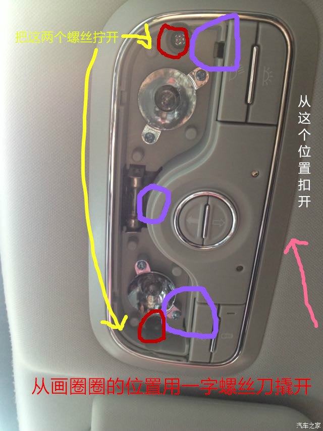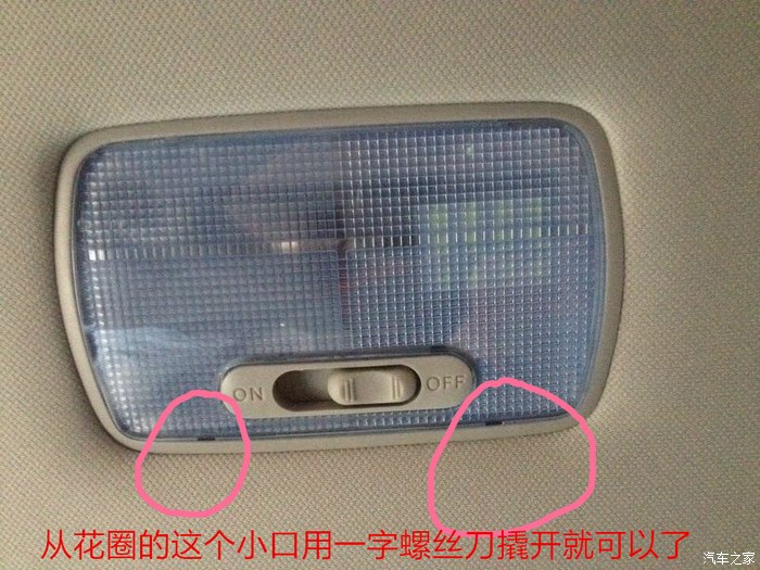 把顶灯拿下来,因为有2个T10的。要从后面拧下来,把灯泡换掉,双尖36MM的比较难安装,地方太窄,我用镊子把灯放进去掰开两边的贴片才弄好。