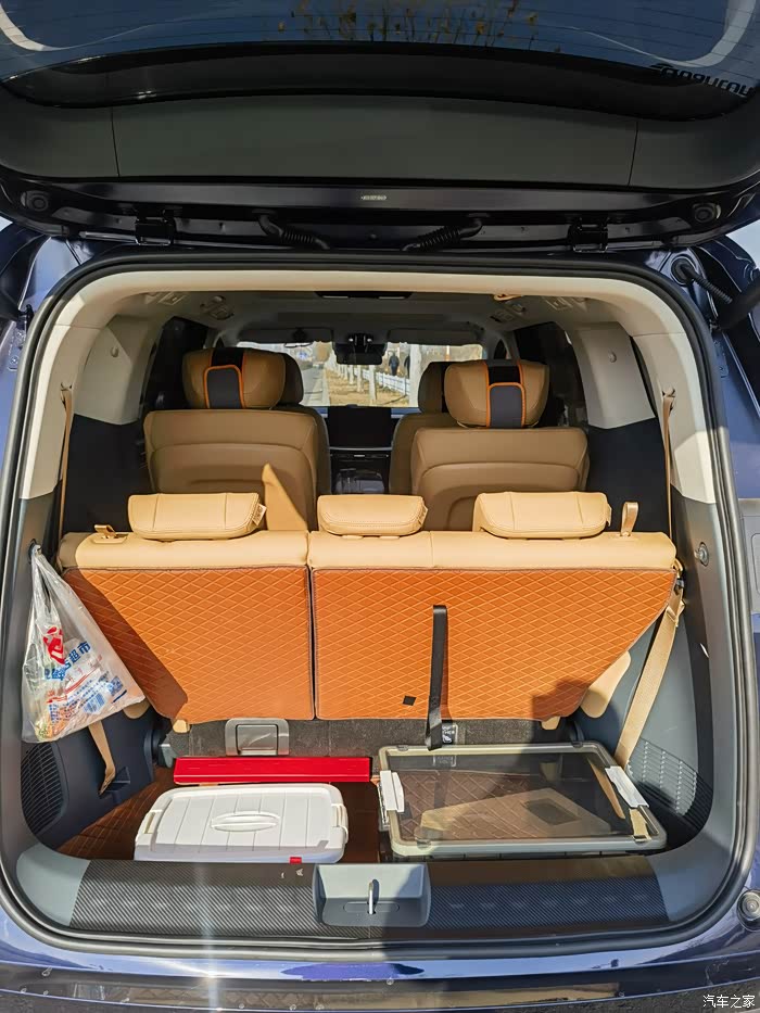 第三排放好,后边的空间还很大,大的透明的箱子是传祺祺享家的储物箱,刚好可以放下,车上有很多挂钩,很方便。