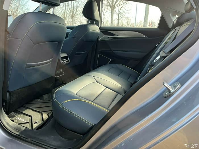 最后是后排空间以及后排座椅的设计,可以看到几何G6这辆车后排空间还算宽敞,宽敞的后排空间设计满足了大多数身材乘客的乘坐需求,不会出现后排乘客乘坐太过约束的情况。此外,车子的座椅颜色比较深,材质也十分抗造,作为网约车后排座椅的耐污性和抗造性还是很重要的。