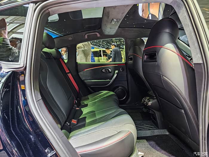 坐进去感体验了下,我跟朋友两人身高都在178cm左右,坐在后排腿部距离还有两拳,这个空间很可以了。抬头就是一大块全景天幕,完全不会有压抑的感觉。