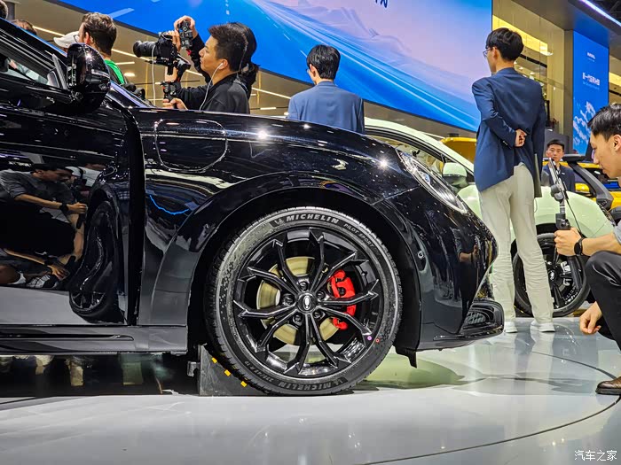 黑色轮毂搭配红色卡钳,运动感相当的强。轮胎还是用的特殊轮胎花纹构造的米其林PS EV轮胎,不仅很个性,稳定性还得到了提升!