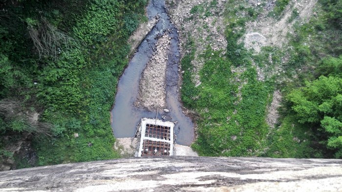 过大坝要从这样的天桥走过去、没有护栏没有任何防护设施、大家看到这样的天桥就可以想到为何有一堵两米高的墙在前面拦着不让人过了、看看下面那么深胆小的人还真不敢走过去