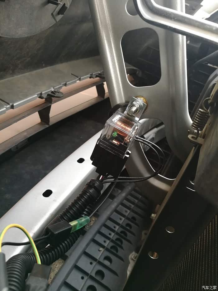 我把两根打铁线和继电器固定在一根螺丝上。中间用螺母隔开。最后把线束用扎线带整理好(最好和水箱隔一段距离)