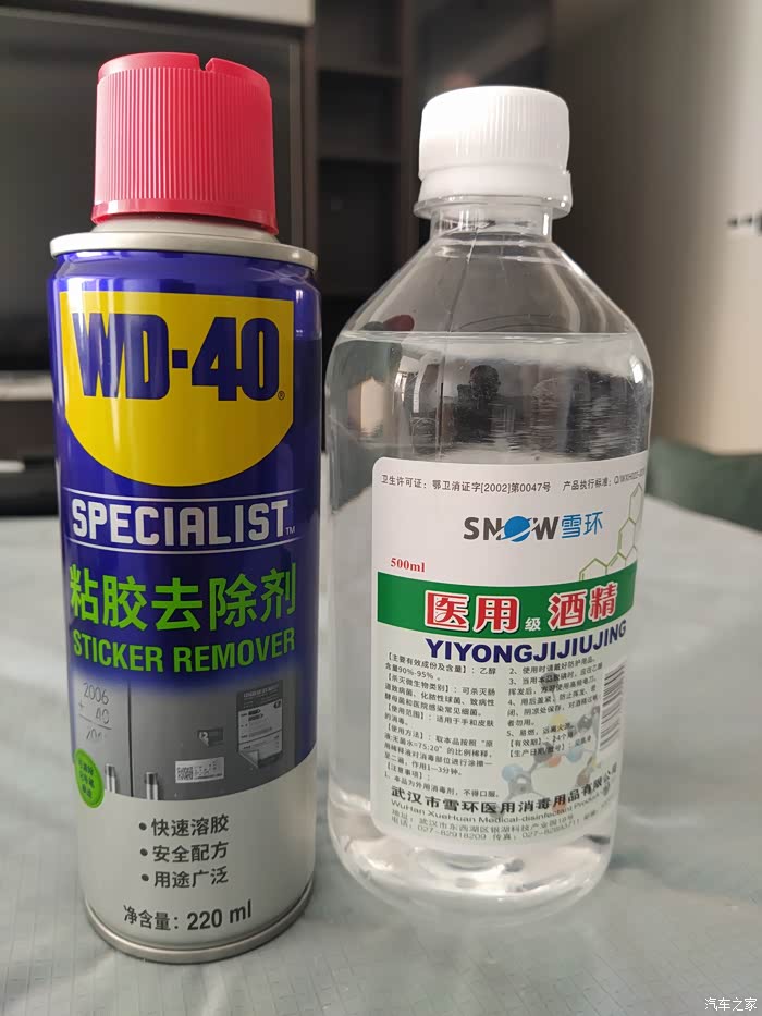 4儿子店送的前挡膜一年半有点点起水波纹了,强迫症不能忍今天自己撕了,怕留胶,专门狗东买的wd40除胶剂,花了我30多,还准备了隔壁药店6元一大瓶的95度酒精。撕的还蛮顺利,留了一点胶,结果wd40喷了擦不掉,用了点酒精,一擦就掉了,wd40真垃圾